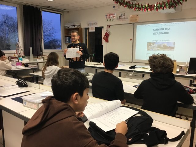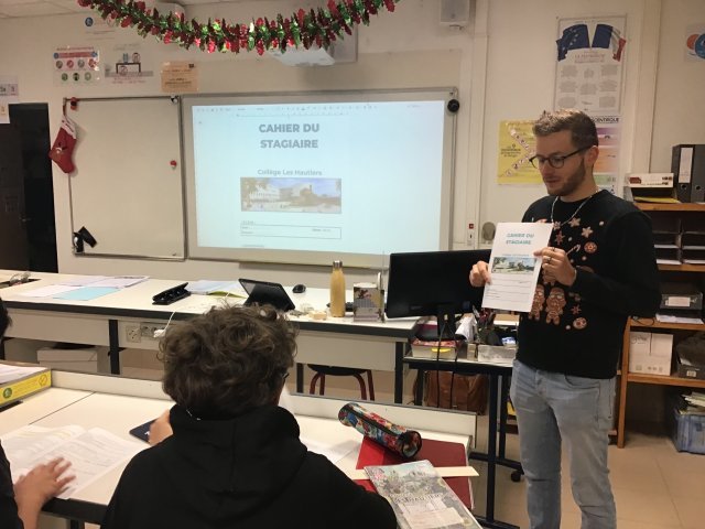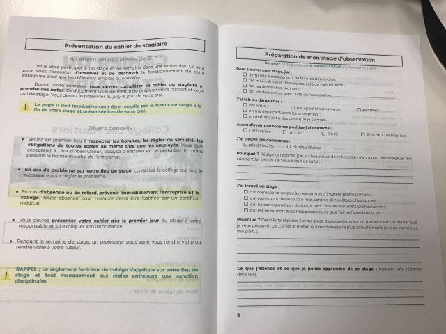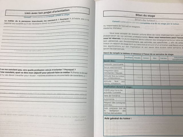 Les élèves de troisième partent en stage en entreprise. Pour les accompagner, les professeurs monsieur Villeret, monsieur Cobat et Mme Frédéric ont réalisé un cahier du stagiaire que les élèves devront compléter.