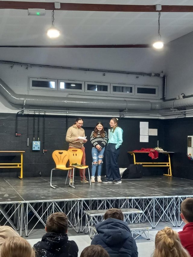 Pour préparer cette sortie, les comédiens sont venus au collège pour jouer quelques saynètes avec les élèves dans la salle Innovante du collège.