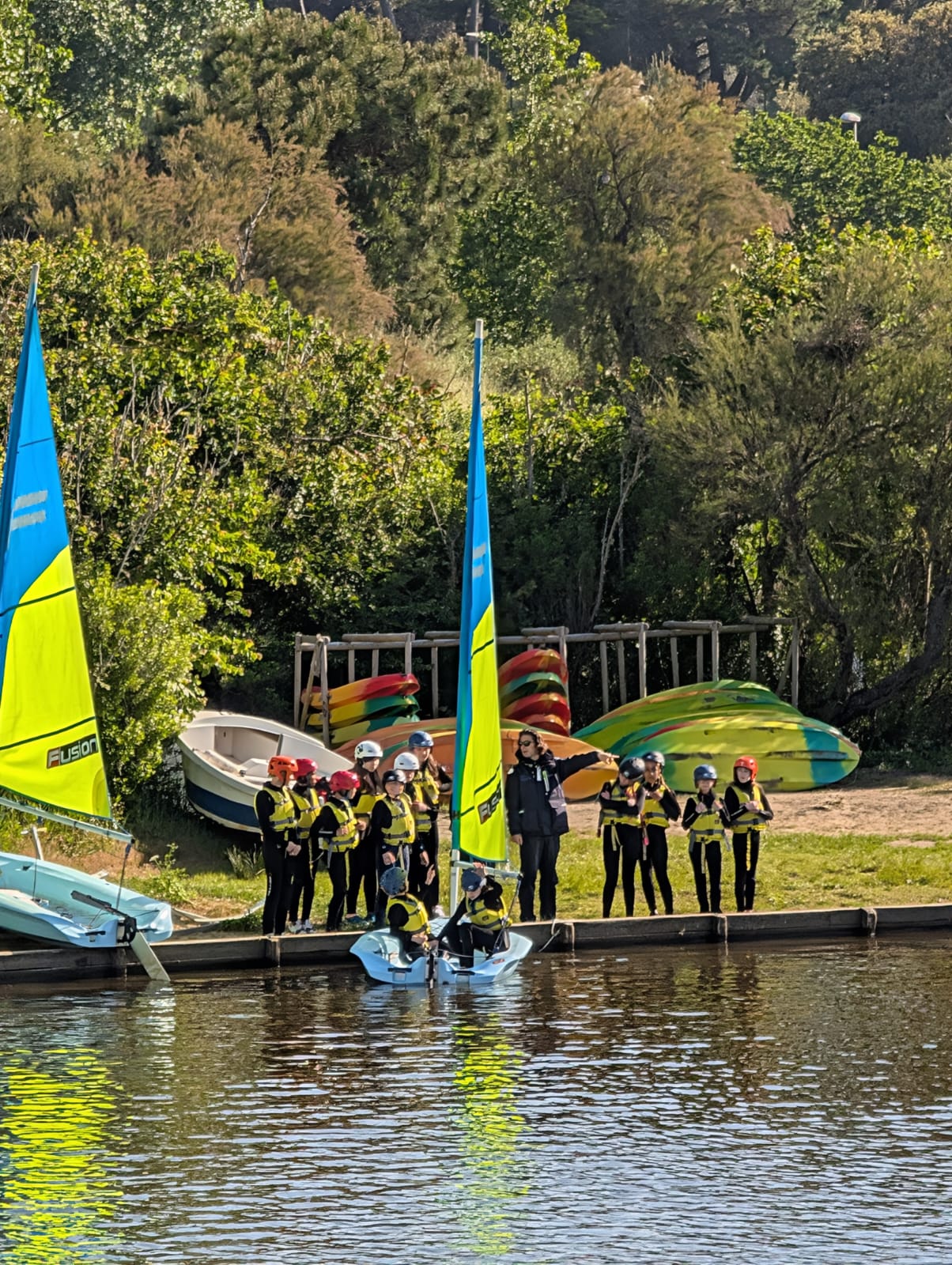 Ce matin, premier pas sur le bateau de type dériveur et découverte de la voile. Les débuts ont été difficiles pour certains groupes en raison des nombreuses bourrasques de vent. Cependant, malgré une petite baignade forcée pour certains, les élèves sont motivés à recommencer demain !
